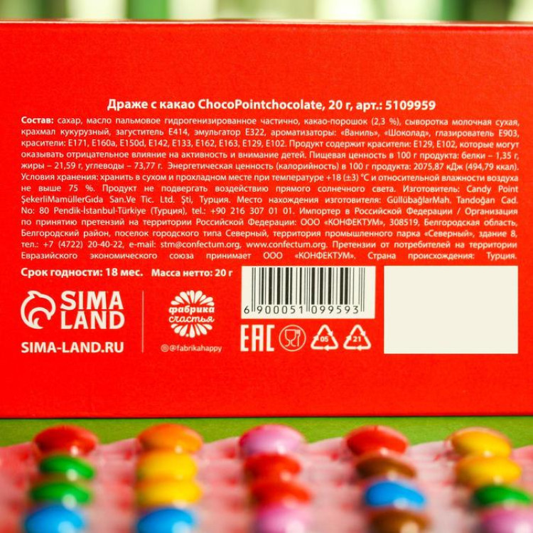 Состав: сахар, масло растительное гидрогенизированное (масло пальмовое), какао-порошок (2,3 %) (содержание какао-масла: 4,0 %), молоко сухое цельное, сыворотка молочная сухая, загуститель: гуммиарабик, эмульгатор: лецитин соевый, ароматизаторы: «Ваниль», «Фундук», «Шоколад»; отбеливатели: воск пчелиный, воск карнаубский; красители пищевые: «Диоксид титана», E160a, E150d, E142, E133, E162, E129, E102. Продукт содержит красители Е102, Е129, которые могут оказывать отрицательное влияние на активность и внимание детей