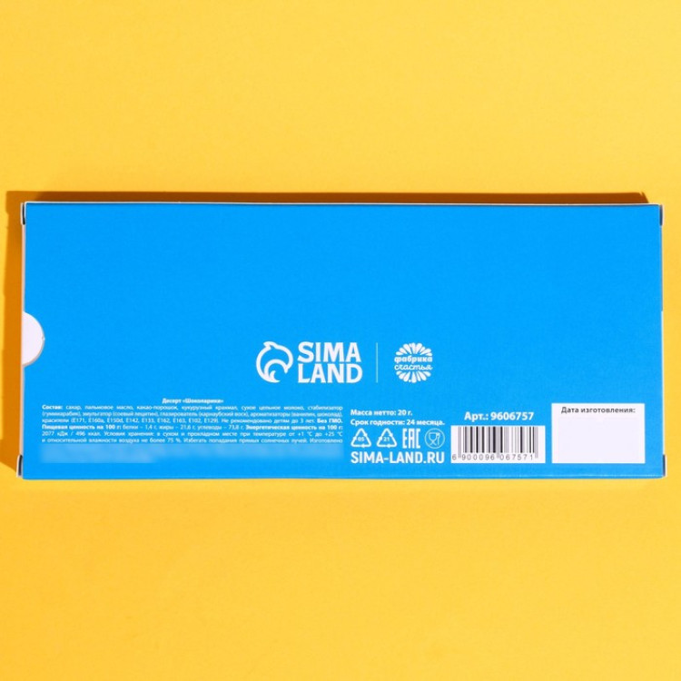 Состав: сахар, пальмовое масло, какао-порошок, кукурузный крахмал, сухое цельное молоко, стабилизатор (гуммиарабик), эмульгатор (соевый лецитин), глазирователь (карнаубский воск), ароматизаторы (ванилин, шоколад), красители (Е171, Е160а, Е150d, Е142, Е133, Е162, Е163, Е102, Е129).