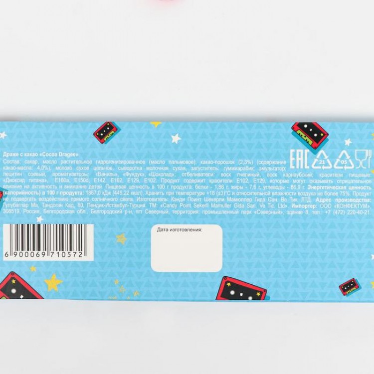 Состав: сахар, масло растительное гидрогенизированное (масло пальмовое), какао-порошок 2,3% (содержание какао-масла – 4 %), молоко сухое цельное, сыворотка молочная сухая, загуститель: гуммиарабик, эмульгатор: лецитин соевый, ароматизаторы: «Ваниль», «Фундук», «Шоколад», отбеливатели: воск пчелиный, воск карнаубский, красители пищевые: Диоксид титана, Е160а, Е150d, Е142, Е162, Е129, Е102. Продукт содержит красители, которые могут оказывать отрицательное влияние на активность и внимание детей.