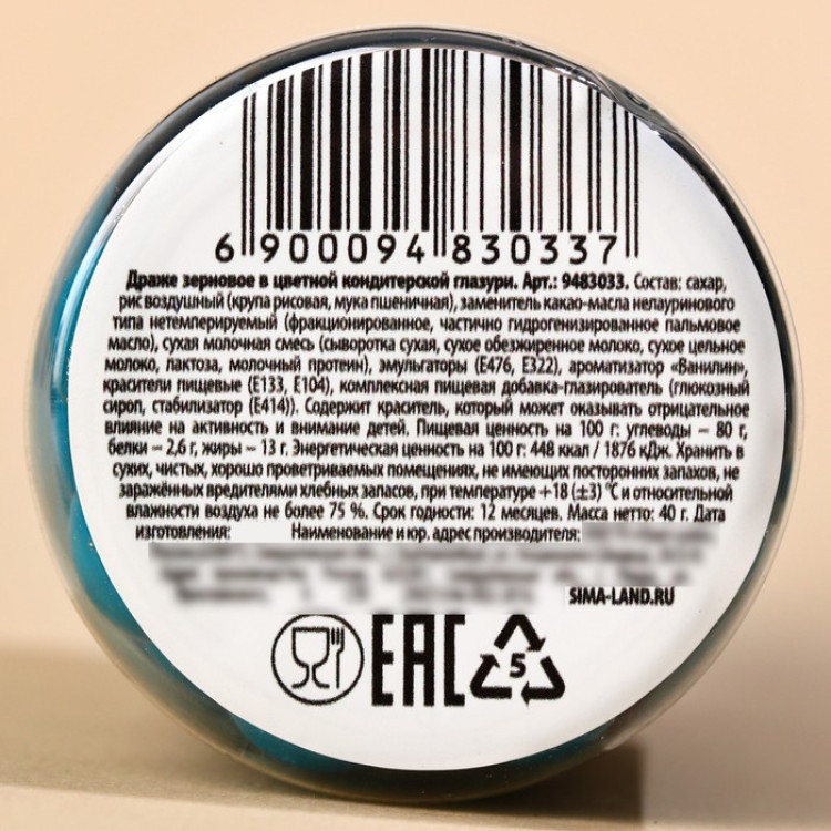 Состав: сахар, рис воздушный (крупа рисовая, мука пшеничная), заменитель какао-масла нелауринового типа нетемперируемый (фракционированное, частично гидрогенизированное пальмовое масло), сухая молочная смесь (сыворотка сухая, сухое обезжиренное молоко, сухое цельное молоко, лактоза, молочный протеин), эмульгаторы: (Е476, Е322), ароматизатор "Ванилин", краситель пищевой (Е104), комплексная пищевая добавка - глазирователь (глюкозный сироп, стабилизатор (Е414)).