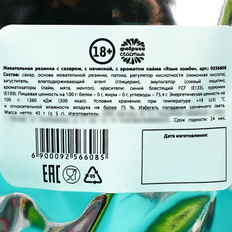 Состав: сахар, основа жевательной резинки, патока, регулятор кислотности (лимонная кислота), загуститель, влагоудерживающий агент (глицерин), эмульгатор (соевый лецитин), ароматизаторы (лайм, мята, ментол) краситель: синий блестящий FCF (Е133), куркумин (Е100).