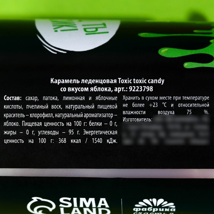 Состав: сахар, патока, лимонная и яблочные кислоты, пчелиный воск, натуральный пищевой краситель – хлорофилл, натуральный ароматизатор – яблоко.