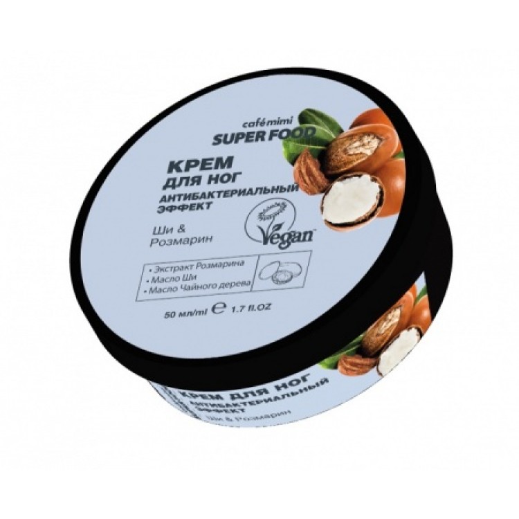 Крем для ног Антибактериальный эффект Ши & Розмарин Cafe mimi в магазине aromagiya.by ✓Приятные ароматы ✓Яркий дизайн ✓Супер-цена ✈Самовывоз и доставка ✈Почтой по РБ. Крем для ног с эфирным маслом Розмарина и Чайного дерева оказывает антибактериальное, противовоспалительное и антисептическое действие. Масло Ши питает, увлажняет и смягчает кожу ног.