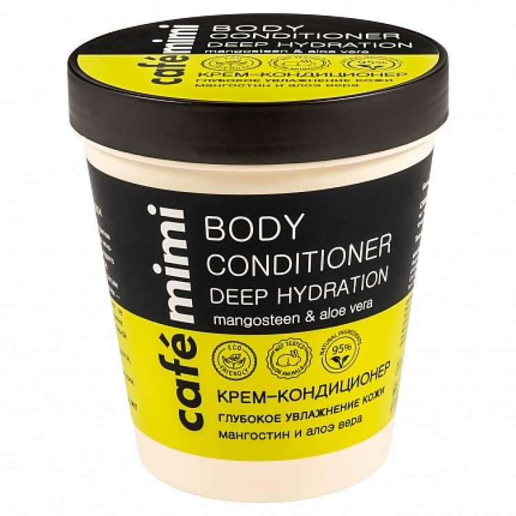Крем-Кондиционер "Глубокое увлажнение кожи" CAFE MIMI с экстрактом мангостина, маслом ши и соком алоэ вера мгновенно насыщает кожу влагой, позволяя надолго забыть о дискомфорте и чувстве стянутости. Активные натуральные ингредиенты в составе кондиционера обладают двойным действием – глубоко увлажняют кожу и препятствуют ее обезвоживанию в течение длительного времени.