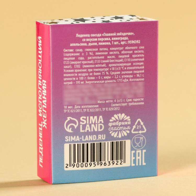 Состав: сахар, глюкозная патока, концентрат яблочного сока (содержание > 3 %), лимонная кислота, яблочная кислота, пищевая сода, растительное масло, пищевой краситель Е123 (амарант красный), Е133 (синий блестящий), Е110 (солнечный закат), Е102 (лимонно-жёлтый), ароматизирующая эссенция.