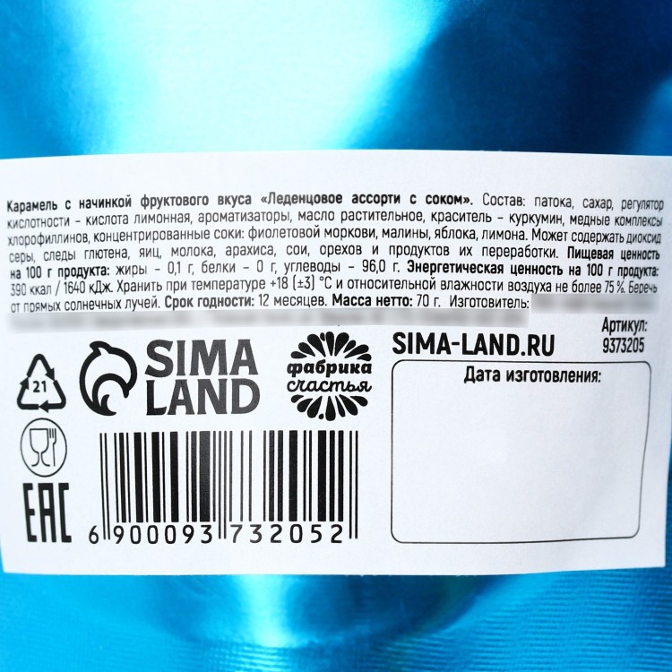 Состав: патока, сахар, регулятор кислотности – кислота лимонная, ароматизаторы, масло растительное, краситель – куркумин, медные комплексы хлорофиллинов, концентрированные соки: фиолетовой моркови, малины, яблока, лимона. Может содержать диоксид серы, следы глютена, яиц, молока, арахиса, сои, орехов и продуктов их переработки.