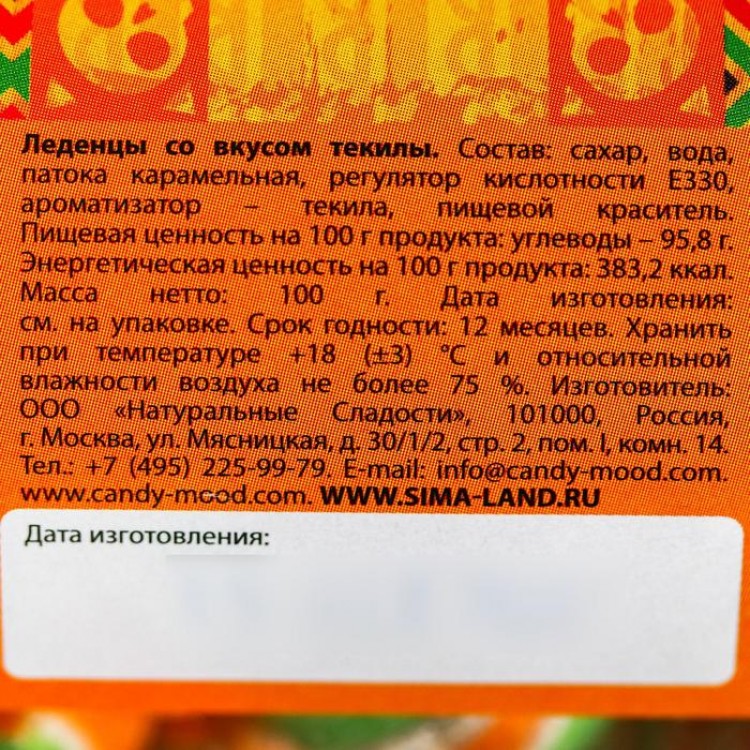 Состав: сахар, вода, патока карамельная, регулятор кислотности Е330, ароматизатор – текила, пищевой краситель.