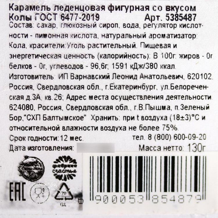 Состав: сахар, глюкозный сироп, вода, регулятор кислотности - лимонная кислота, натуральный ароматизатор: Кола, краситель: Уголь растительный.