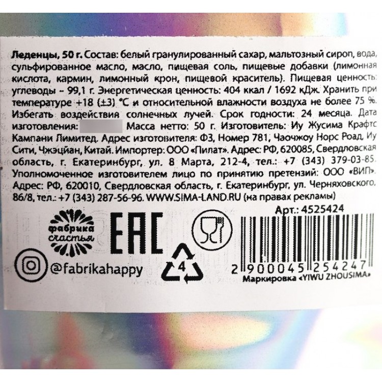 Состав: белый гранулированный сахар, мальтозный сироп, вода, сульфированное масло, пищевая соль, пищевые добавки (лимонная кислота, кармин, лимонный крон, пищевой краситель).
