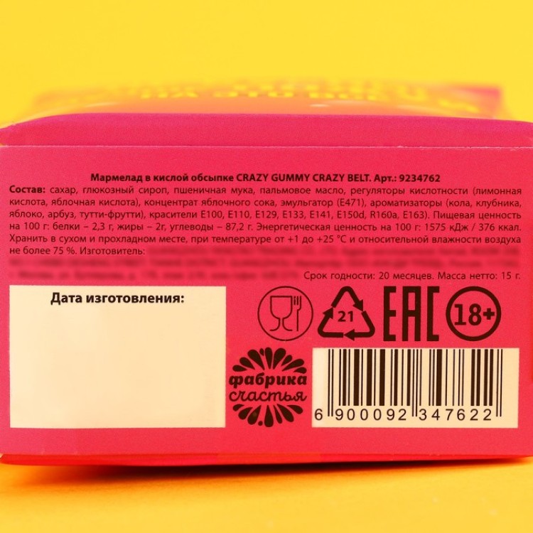 Состав: сахар, глюкозный сироп, пшеничная мука, пальмовое масло, регуляторы кислотности (лимонная кислота, яблочная кислота), концентрат яблочного сока, эмульгатор (Е471), ароматизаторы (кола, клубника, яблоко, арбуз, тутти-фрутти), красители Е100, Е110, Е129, Е133, Е141, Е150d, R160a, E163).