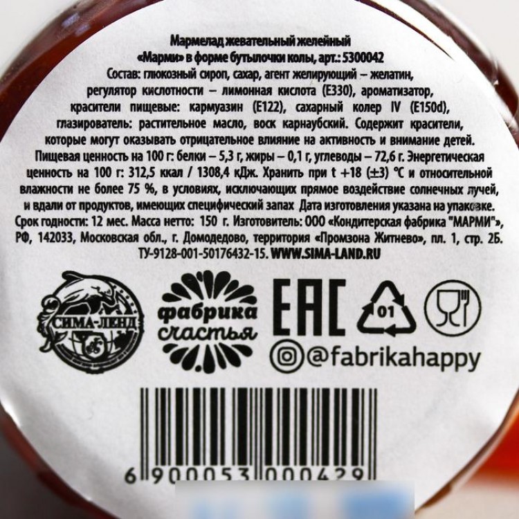 Состав: глюкозный сироп, сахар, агент желирующий – желатин, регулятор кислотности – лимонная кислота (Е330), ароматизатор, красители пищевые: кармуазин (Е122), сахарный колер IV (Е150d), глазирователь: растительное масло, воск карнаубский.