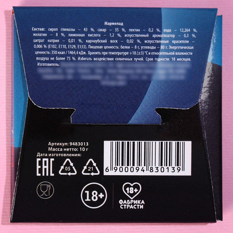 Состав: сироп глюкозы- 43 %, сахар - 35 %, пектин - 0,2 %, воды - 12,264 %, желатин - 8 %, лимонная кислота - 1,2 %, искусственный ароматизатор - 0,3 %, цитрат натрия - 0,01 %, карнаубский воск - 0,02 %, искусственный красители - 0,006 % (Е102, Е110, Е129, Е133).