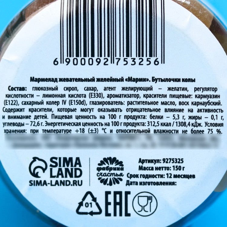 Состав: глюкозный сироп, сахар, агент желирующий – желатин, регулятор кислотности – лимонная кислота (Е330), ароматизатор, красители пищевые: кармуазин (Е122), сахарный колер IV (Е150d), глазирователь: растительное масло, воск карнаубский.Содержит красители, которые могут оказывать отрицательное влияние на активность и внимание детей.