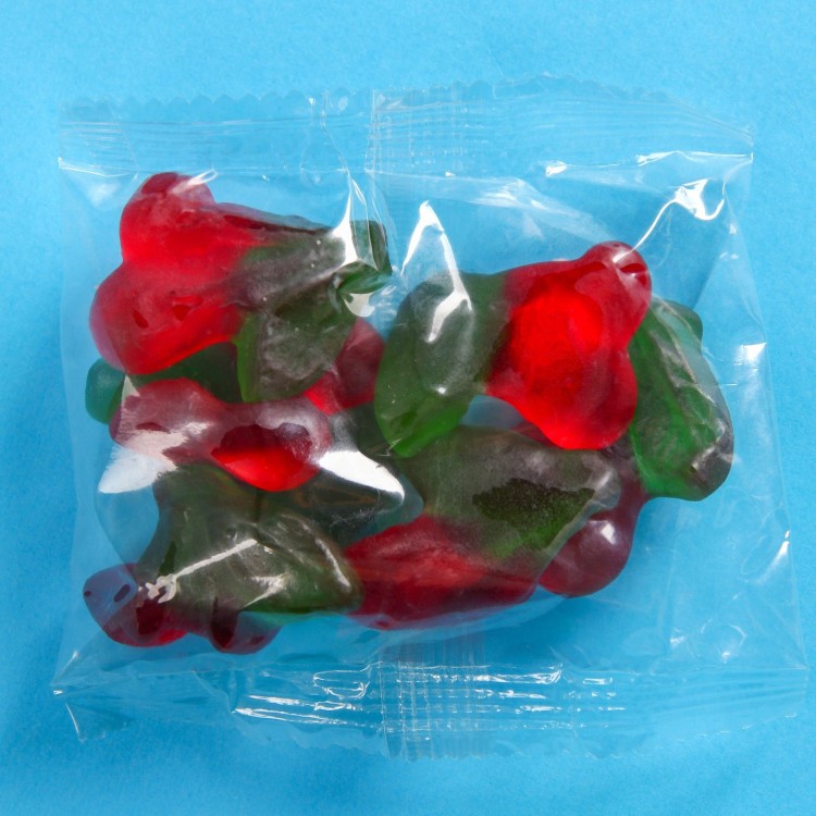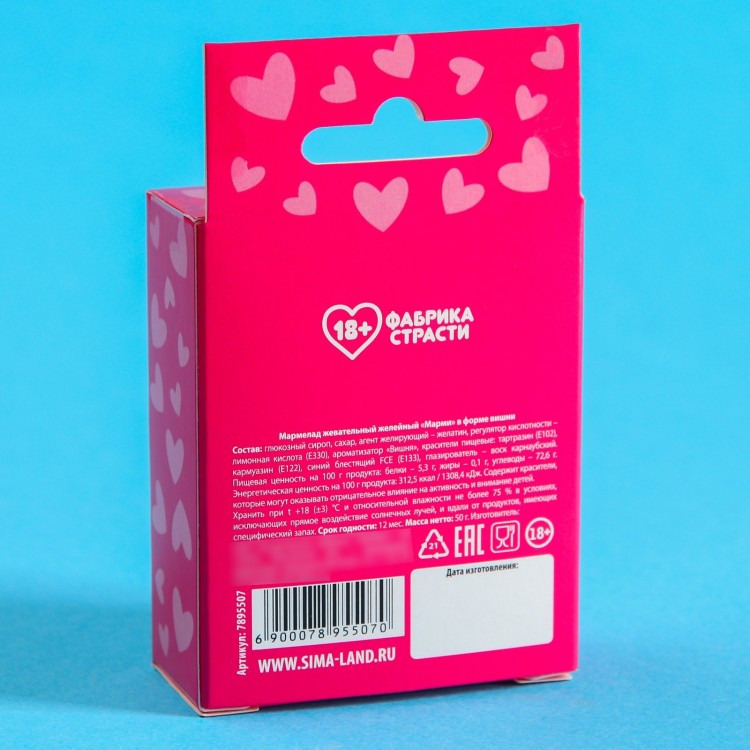 Состав: глюкозный сироп, сахар, агент желирующий – желатин, регулятор кислотности – лимонная кислота (Е330), ароматизатор «Вишня», красители пищевые: тартазин (Е102), кармуазин (Е122), синий блестящий FCE (Е133), глазирователь – воск карнаубский.