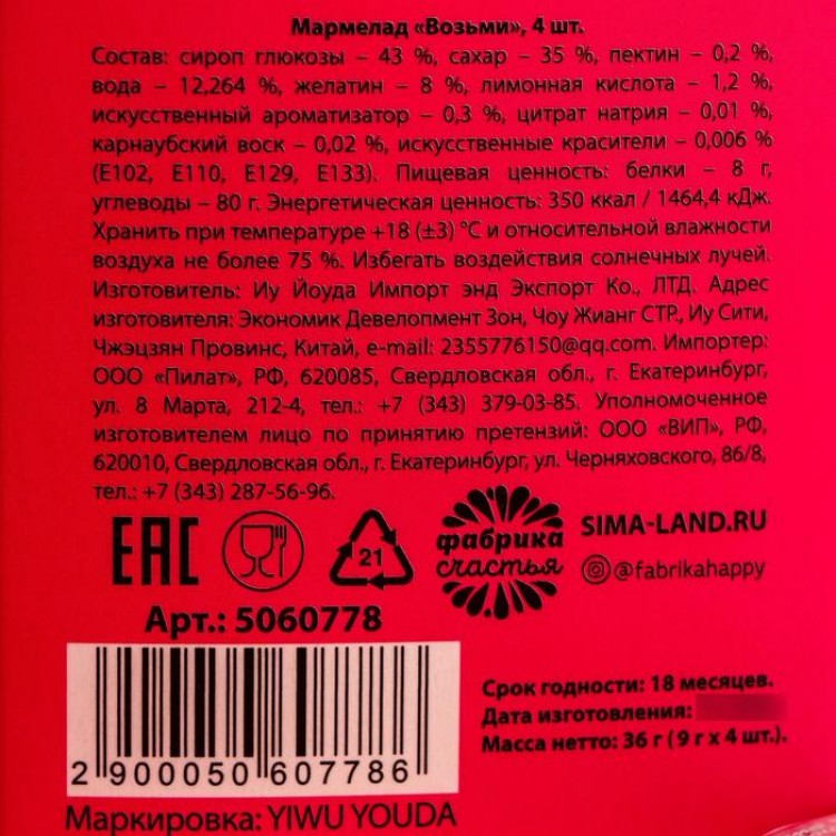 Мармелад «Возьми», 9 г. х 4 шт. в магазине aromagiya.by ✓Скидка подписчикам инстаграм sladosti_s_prikolom 10% ✈Магазин в ТЦ Силуэт и доставка почтой по РБ. Прямой поставщик, лучшие цены и выбор. Собираем красивые подарочные боксы собственных дизайнов в специально разработанную под сладости упаковку.