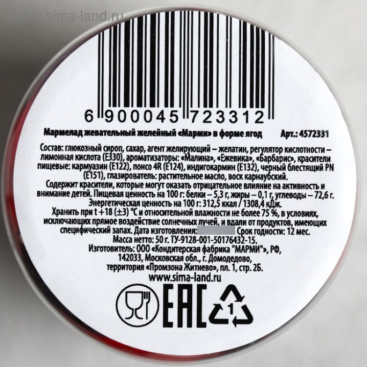 Состав: глюкозный сироп, сахар, агент желирующий – желатин, регулятор кислотности – лимонная кислота (Е330), ароматизаторы: «Малина», «Ежевика», «Барбарис», красители пищевые: кармуазин (Е122), понсо 4R (Е124), индигокармин (Е132), черный блестящий PN (Е151), глазирователь: растительное масло, воск карнаубский.