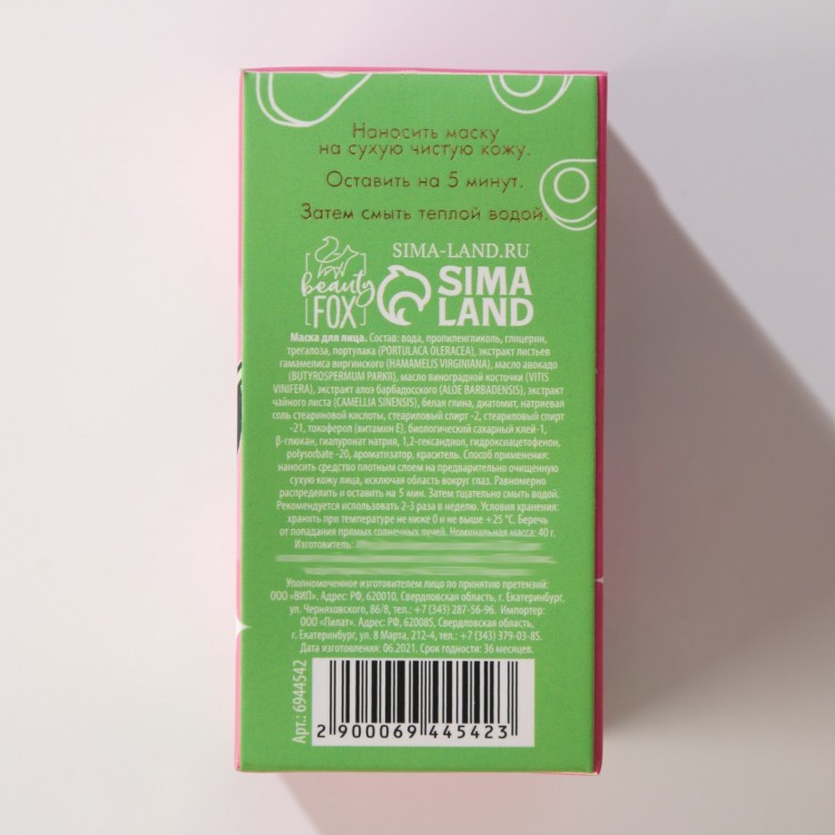 Состав: вода, пропиленгликоль, глицерин, трегалоза, портулака (PORTULACA OLERACEA), экстракт листьев гамамелиса виргинского (HAMAMELIS VIRGINIANA), масло авокадо (BUTYROSPERMUM PARKII), масло виноградной косточки (VITIS VINIFERA), экстракт алоэ барбадосского (ALOE BARBADENSIS), экстракт чайного листа (CAMELLIA SINENSIS), белая глина, диатомит, натриевая соль стеариновой кислоты, стеариловый спирт -2, стеариловый спирт -21, токоферол (витамин Е), биологический сахарный клей-1, β-глюкан, гиалуронат натрия, 1,2-гександиол, гидроксиацетофенон, polysorbate -20, ароматизатор, краситель.