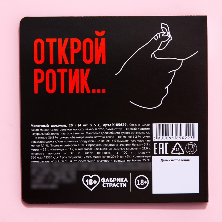 Состав: сахар, какао-масло, сухое цельное молоко, какао тёртое, эмульгатор – соевый лецитин, натуральный ароматизатор «Ваниль».