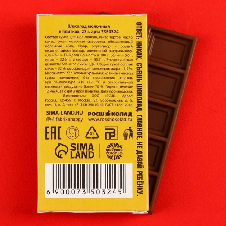 Состав: сухое цельное молоко, какао тёртое, масло какао, сухая молочная сыворотка, обезвоженный молочный жир, сахар, эмульгатор – соевый лецитин, ароматизатор, идентичный натуральному, «Ванилин».