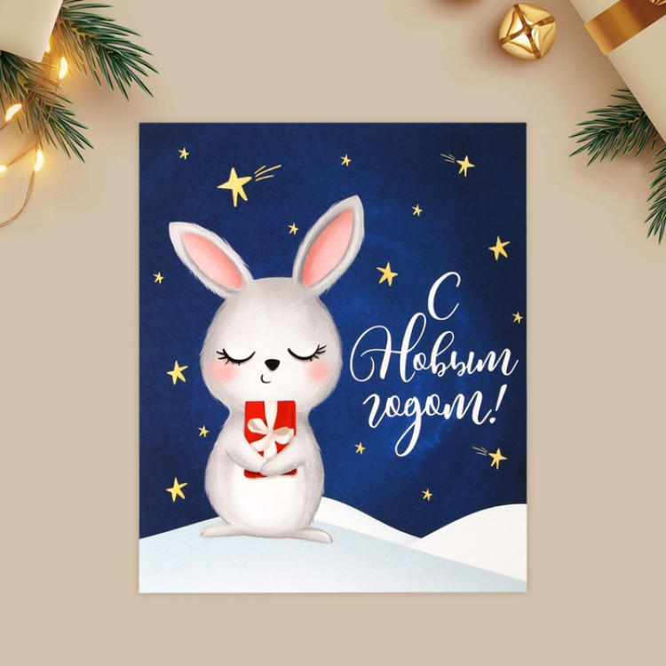 Открытка-мини «С Новым годом!», заяц с подарком 10.7 × 8.8 см.