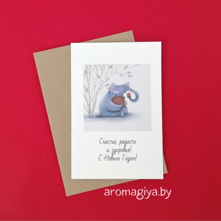 Открытка с милым слоником в Минске и по РБ Арт.590 в магазине aromagiya.by ✓Огромный выбор ✓Низкие цены ✓Свое производство ✈Самовывоз и доставка ✈Можно почтой. Открытки на Новый Год с добрым и черным юмором, нейтральные открытки, открытки на Рождество. Каждая открытка в защитной пленке. С конвертами и без конвертов. Интересные открытки в огромном ассортименте, производство открыток.