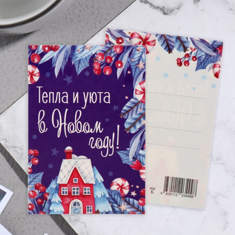 Открытка-шильдик "Тепла и уюта в Новом Году!" фиолетовый фон.
