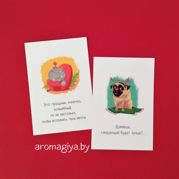 Новогодние открытки собственного производства Арт.671-672 в магазине aromagiya.by ✓Огромный выбор ✓Низкие цены ✓Свое производство ✈Самовывоз и доставка ✈Можно почтой. Открытки на Новый Год с добрым и черным юмором, нейтральные открытки, открытки на Рождество. Каждая открытка в защитной пленке. С конвертами и без конвертов. Интересные открытки в огромном ассортименте, производство открыток.