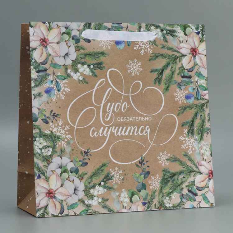 Пакет крафтовый квадратный «Чудо», 30 × 30 × 12 см.