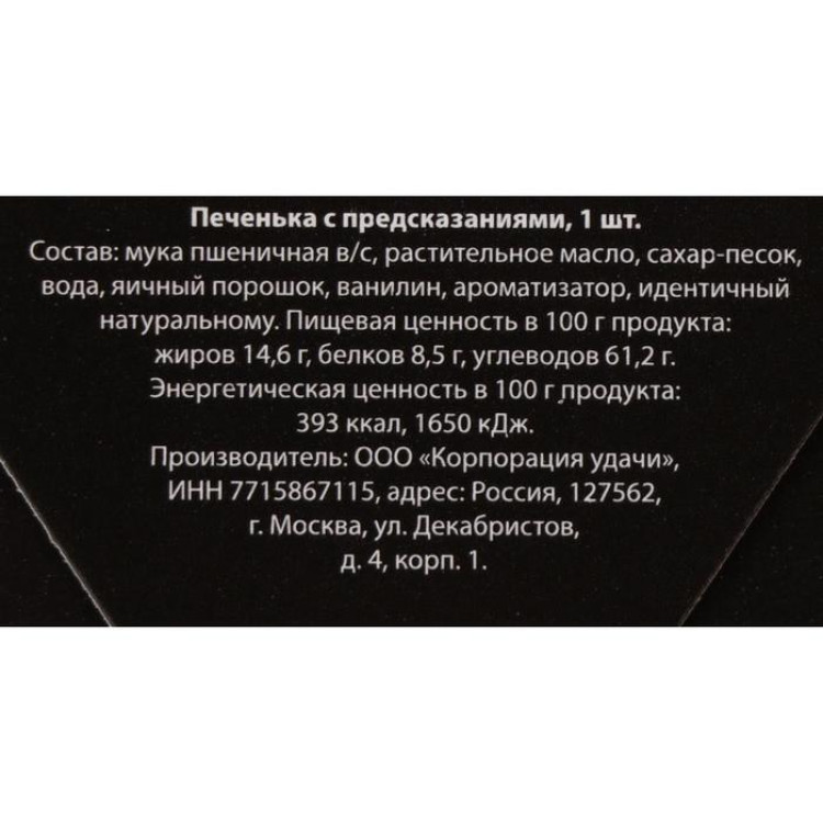 Это печенье представляет собой небольшое хрустящее лакомство, в котором запечен листочек с предсказанием. Печенье может стать не только вкусным десертом, но и отличным вариантом подарка близкому человеку. Он обязательно оценит неординарный подход, а оригинальная надпись-сюрприз оставит после себя массу положительных эмоций!