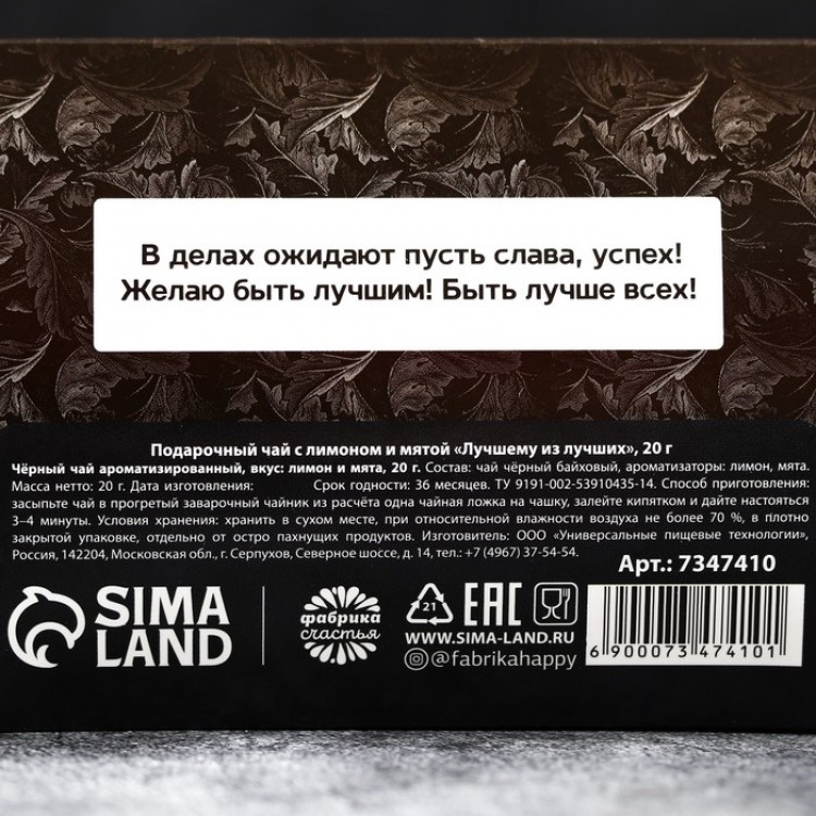 Подарочный чёрный чай «Лучшему из лучших» с лимоном и мятой, 20 г. в магазине aromagiya.by ✓Скидка подписчикам инстаграм sladosti_s_prikolom 10% ✈Магазин в ТЦ Силуэт и доставка почтой по РБ. Прямой поставщик, лучшие цены и выбор. Собираем красивые подарочные боксы собственных дизайнов в специально разработанную под сладости упаковку.