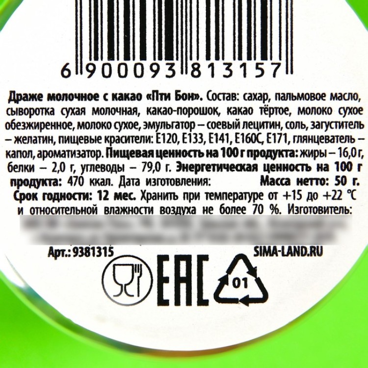 Состав: сахар, пальмовое масло, сыворотка сухая молочная, какао-порошок, какао тёртое, молоко сухое обезжиренное, молоко сухое, эмульгатор – соевый лецитин, соль, загуститель – желатин, пищевые красители: Е120, Е133, Е141, Е160С, Е171, глянцеватель – капол, ароматизатор.
