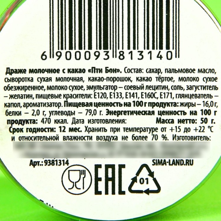 Состав: сахар, пальмовое масло, сыворотка сухая молочная, какао-порошок, какао тёртое, молоко сухое обезжиренное, молоко сухое, эмульгатор – соевый лецитин, соль, загуститель – желатин, пищевые красители: Е120, Е133, Е141, Е160С, Е171, глянцеватель – капол, ароматизатор.