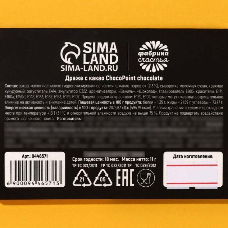 Состав: сахар, масло пальмовое гидрогенизированное частично, какао-порошок (2,3 %), сыворотка молочная сухая, крахмал кукурзный, загуститель Е141, эмульгатор Е322, ароматизаторы: "Ванилин", "Шоколад", глазирователь Е903, красители: Е171, Е160а, Е150d, Е142, Е133, Е162, Е163, Е129, Е102.