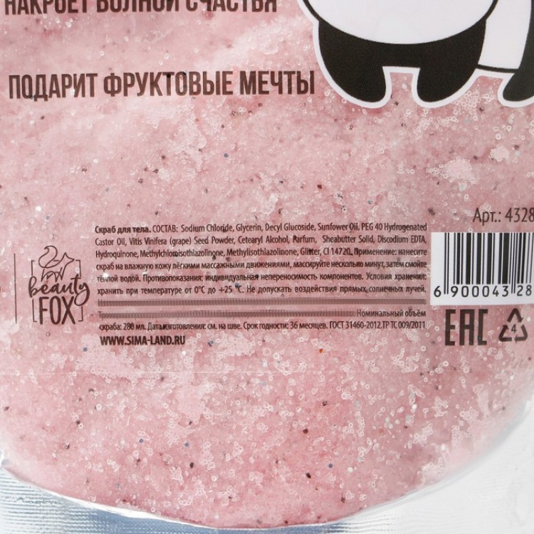 СОСТАВ: Sodium Chloride, Glycerin, Decyl Glucoside, Sunfower Oil, PEG 40 Hydrogenated Castor Oil, Vitis Vinifera (grape) seed powder, Cetearyl Alcohol, Parfum, Sheabutter solid, Discodium EDTA, Hydroquinone, Methylchloroisothiazolinone, Methylisothiazolinone, Glitter