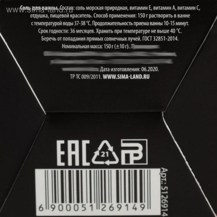 Состав: соль морская, аромамасло, парфюмерная композиция, краситель фруктов.