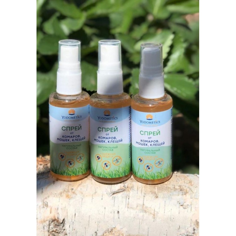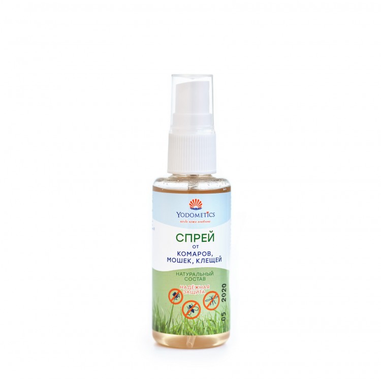 Натуральный спрей-репеллент Yodometics для защиты людей от нападения комаров, мошек, клещей и других кровососущих насекомых на протяжении 2-3 часов.