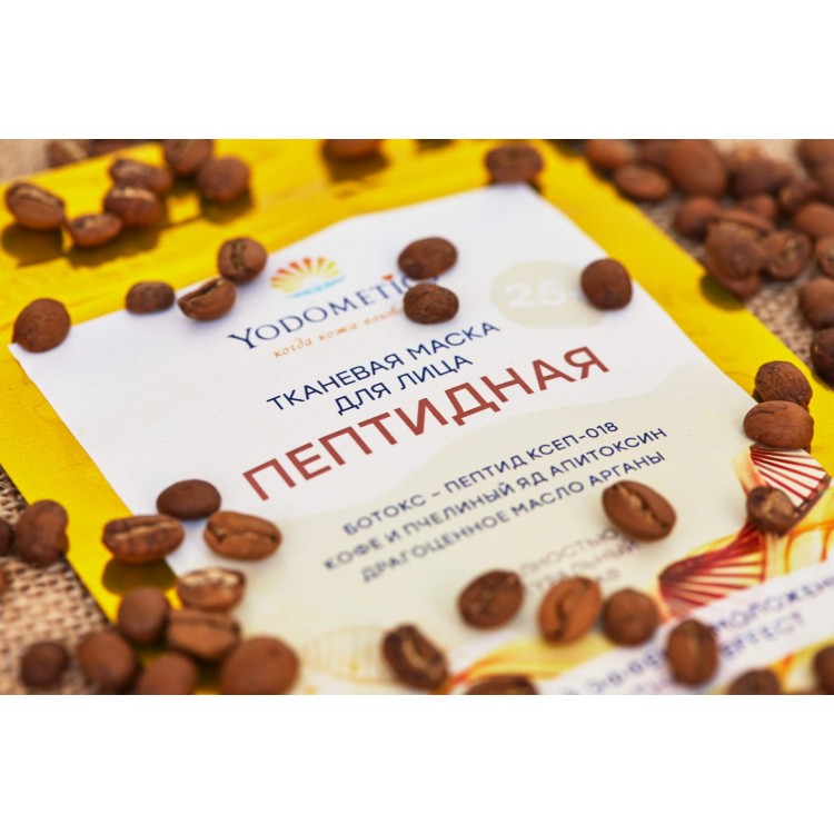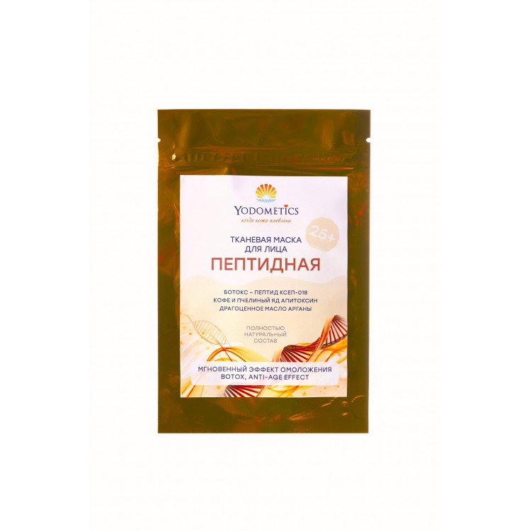 Высокоэффективная натуральная тканевая маска для лица Пептидная от Yodometics в магазине aromagiya.by ✓Скидка 10% ✈Самовывоз и доставка ✈Почтой по РБ. Маска обеспечивает мгновенный подтягивающий эффект за счет ботокс–пептида КСЕП-018 и пчелиного яда апитоксина. Препараты обладают выраженным расслабляющим действием на мимическую мускулатуру