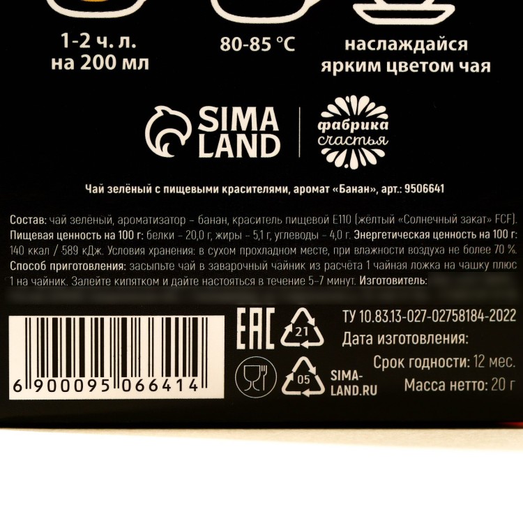 Состав: чай зелёный, ароматизатор - банан, краситель пищевой Е110 (жёлтый "Солнечный закат" FCF).