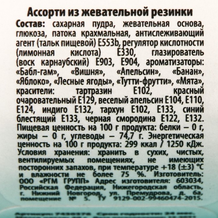 Состав: сахарная пудра, жевательная основа, глюкоза, патока крахмальная, антислеживающий агент (тальк пищевой) Е553b, регулятор кислотности (лимонная кислота) Е330, глазирователь (воск карнаубский) Е903, Е904, ароматизаторы: «Бабл-гам», «Вишня», «Апельсин», «Банан», «Яблоко», «Лесные ягоды», «Тутти-фрутти», «Мята», красители: тартразин Е102, красный очаровательный Е129, веселый апельсин Е104, Е110, Е124, индиго Е132, тархун Е102, Е133, синий блестящий Е133, черная смородина Е122, Е132.