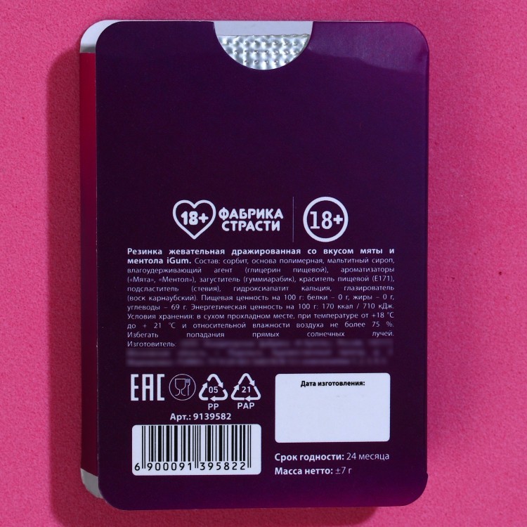 Состав: сорбит, основа полимерная, мальтитный сироп, влагоудерживающий агент (глицерин пищевой), ароматизаторы («Мята», «Ментол»), загуститель (гуммиарабик), краситель пищевой (Е171), подсластитель (стевия), гидроксиапатит кальция, глазирователь (воск карнаубский).