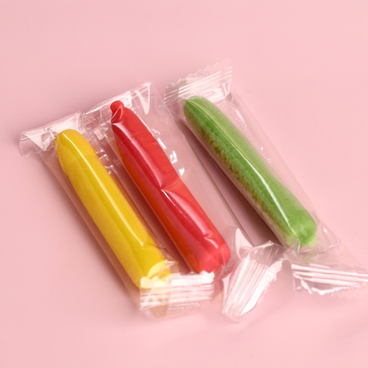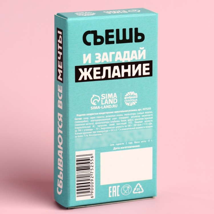 Состав: сахар, сироп глюкозы, резиновая основа, эмульгаторы (соевый лецитин, гуммиарабик), влагоудерживающий агент (глицерин), регулятор кислотности (лимонная кислота), ароматизаторы (клубника, банан, арбуз), красители (красный очаровательный АС, тартразин, синий блестящий FCF).